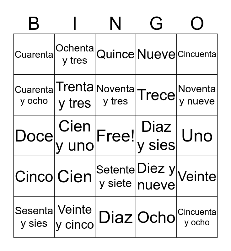 This bingo card has a free space and 24 words: Cien, Veinte y cinco, Noventa y tres, Sesenta y sies, Cincuenta, Cuarenta, Cuarenta y ocho, Ochenta y tres, Diaz y sies, Setente y siete, Trece, Doce, Diez y nueve, Veinte, Trenta y tres, Ocho, Uno, Quince, Noventa y nueve, Cien y uno, Cincuenta y ocho, Cinco, Nueve and Diaz.