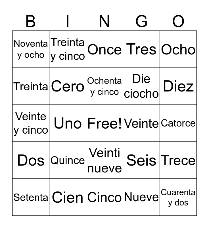 This bingo card has a free space and 24 words: Quince, Cien, Ochenta y cinco, Setenta, Ocho, Noventa y ocho, Treinta, Treinta y cinco, Veinte, Veinti nueve, Die ciocho, Veinte y cinco, Seis, Trece, Cero, Nueve, Catorce, Once, Diez, Uno, Cuarenta y dos, Dos, Tres and Cinco.