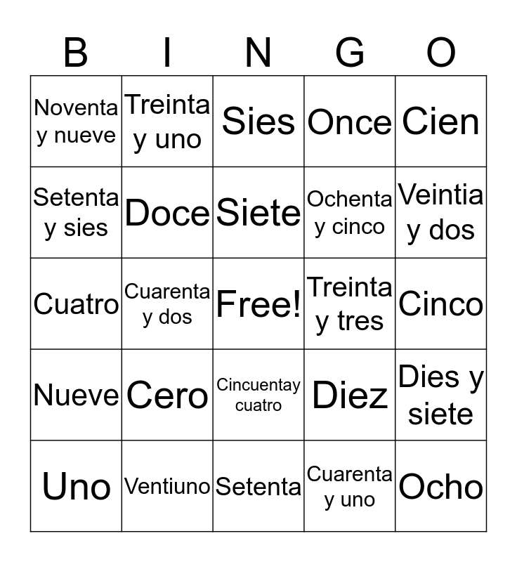 This bingo card has a free space and 24 words: Cero, Ventiuno, Siete, Uno, Cien, Noventa y nueve, Setenta y sies, Treinta y uno, Treinta y tres, Cincuentay cuatro, Ochenta y cinco, Cuatro, Diez, Dies y siete, Doce, Cuarenta y uno, Cinco, Sies, Veintia y dos, Cuarenta y dos, Ocho, Nueve, Once and Setenta.