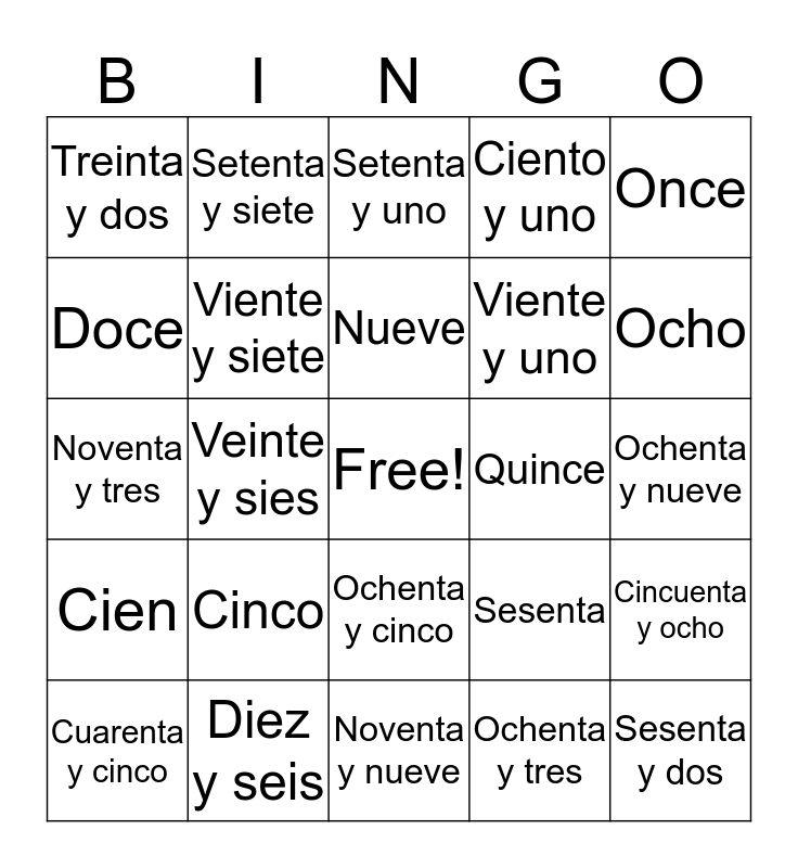 This bingo card has a free space and 24 words: Cinco, Diez y seis, Nueve, Cuarenta y cinco, Once, Treinta y dos, Doce, Setenta y siete, Quince, Ochenta y cinco, Viente y uno, Noventa y tres, Sesenta, Cincuenta y ocho, Viente y siete, Ochenta y tres, Ochenta y nueve, Setenta y uno, Ocho, Veinte y sies, Sesenta y dos, Cien, Ciento y uno and Noventa y nueve.