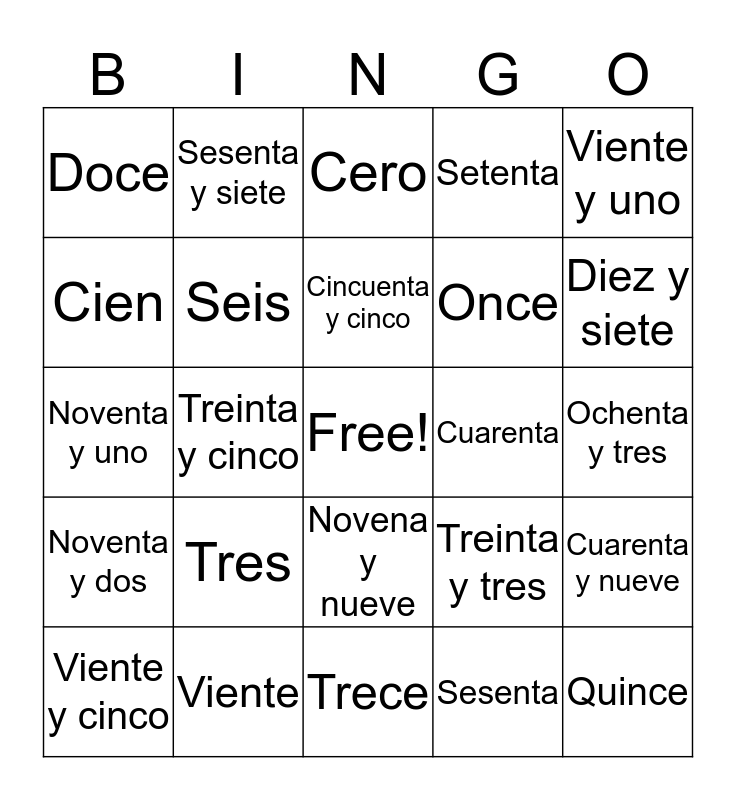 This bingo card has a free space and 24 words: Tres, Viente, Cincuenta y cinco, Viente y cinco, Viente y uno, Doce, Cien, Sesenta y siete, Cuarenta, Novena y nueve, Once, Noventa y uno, Treinta y tres, Cuarenta y nueve, Seis, Sesenta, Ochenta y tres, Cero, Diez y siete, Treinta y cinco, Quince, Noventa y dos, Setenta and Trece.