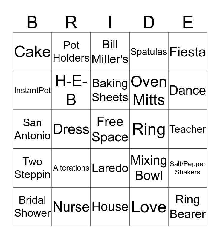 This bingo card has a free space and 29 words: Bridal Shower, Veil, Dress, Flowers, Cake, Bill Miller's, H-E-B, Alterations, Ring, Nurse, Teacher, Ring Bearer, House, Love, Dance, High Heels, Laredo, Two Steppin, Fiesta, San Antonio, Mixing Bowl, Vacuum Cleaner, Oven Mitts, InstantPot, Spatulas, Pot Holders, Salt/Pepper Shakers, Baking Sheets and Pots & Pans.