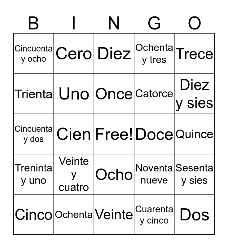 This bingo card has a free space and 24 words: Veinte y cuatro, Ochenta, Once, Cinco, Trece, Cincuenta y ocho, Trienta, Cero, Doce, Ocho, Catorce, Cincuenta y dos, Noventa nueve, Sesenta y sies, Uno, Cuarenta y cinco, Quince, Diez, Diez y sies, Cien, Dos, Treninta y uno, Ochenta y tres and Veinte.