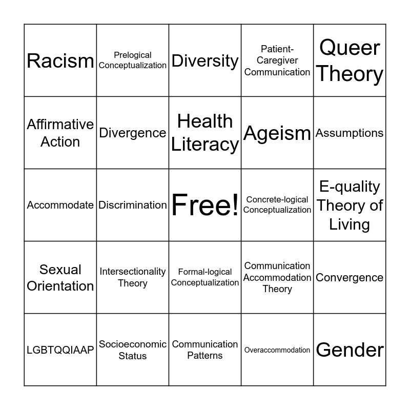 This bingo card has a free space and 24 words: Intersectionality Theory, Socioeconomic Status, Health Literacy, LGBTQQIAAP, Queer Theory, Racism, Affirmative Action, Prelogical Conceptualization, Concrete-logical Conceptualization, Formal-logical Conceptualization, Ageism, Accommodate, Communication Accommodation Theory, Convergence, Divergence, Overaccommodation, E-quality Theory of Living, Diversity, Assumptions, Discrimination, Gender, Sexual Orientation, Patient-Caregiver Communication and Communication Patterns.