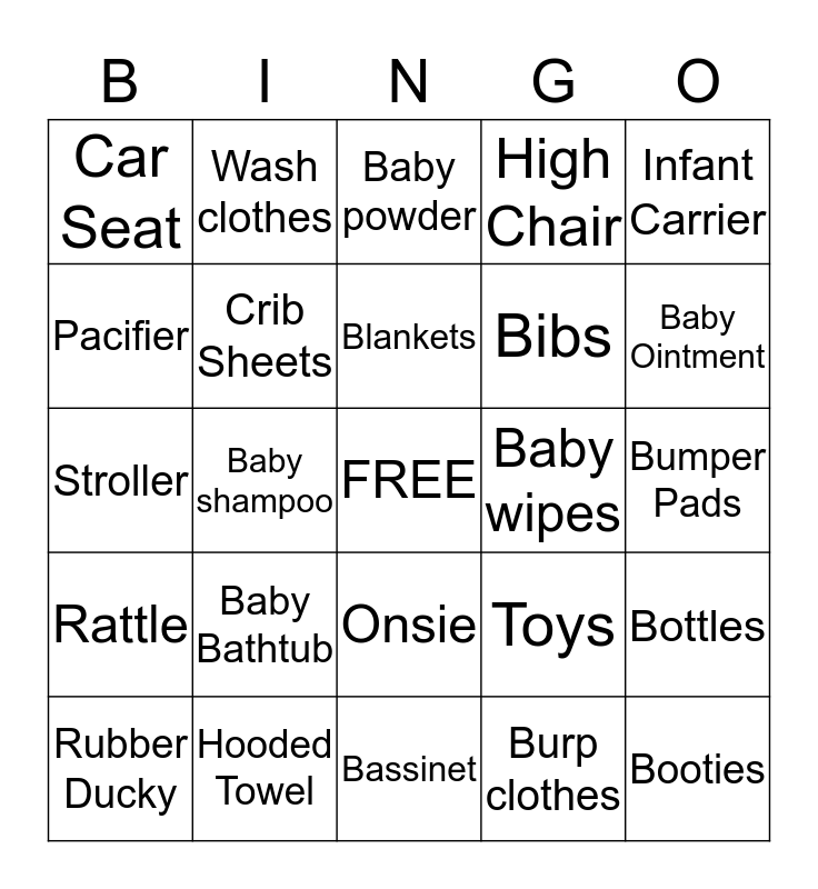 This bingo card has a free space and 24 words: Baby Bathtub, Hooded Towel, Blankets, Rubber Ducky, Infant Carrier, Car Seat, Pacifier, Wash clothes, Baby wipes, Onsie, Bibs, Stroller, Toys, Bottles, Crib Sheets, Burp clothes, Bumper Pads, Baby powder, Baby Ointment, Baby shampoo, Booties, Rattle, High Chair and Bassinet.