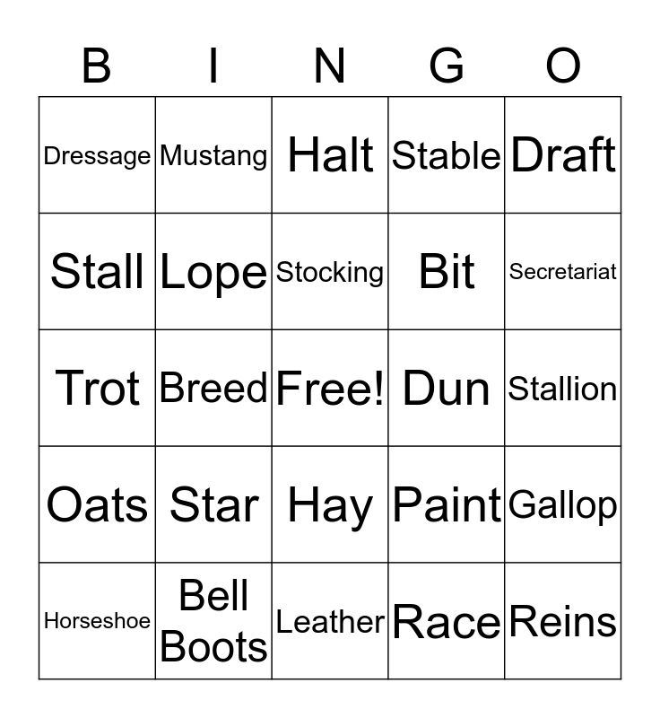 This bingo card has a free space and 54 words: Horse, Oats, Grain, Grass, Hay, Spirit, Stable, Barn, Stall, Barrel, Dressage, Bridle, Bell Boots, Horseshoe, Stirrups, Leather, Reins, Bit, Arabian, Stallion, Paint, Palomino, Dun, Draft, Quarter Horse, Mustang, Pinto, Appaloosa, Gelding, Race, Hack, Jump, Mount, Canter, Halt, Walk, Trot, Gallop, Jog, Lope, Trail, Foal, Tail, Neigh, Star, Strip, Star, Sock, Stocking, Breed, Secretariat, Derby, Red Velvet and Black Beauty.