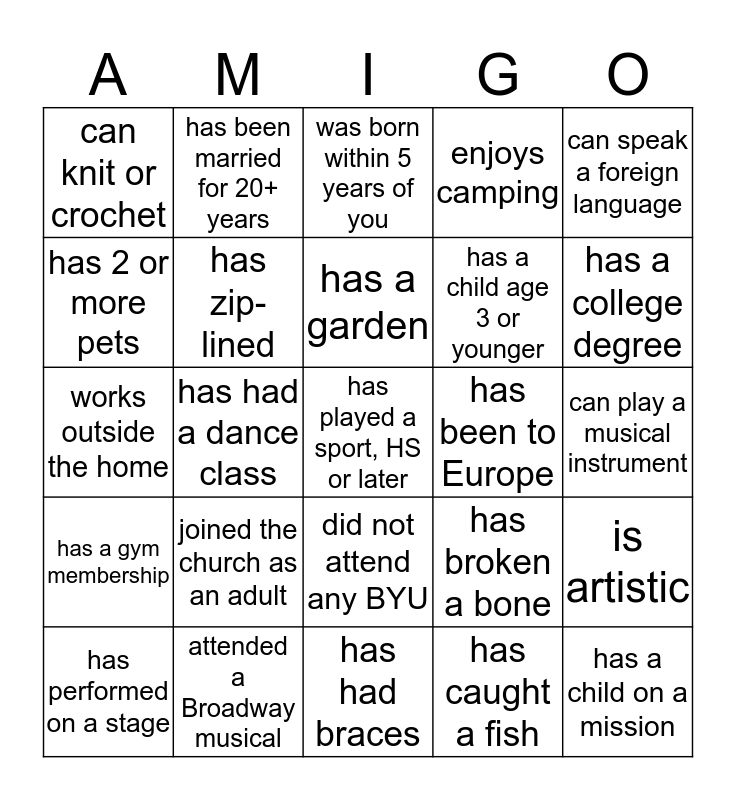 This bingo card has a free space and 24 words: joined the church as an adult, attended a Broadway musical, has a garden, has performed on a stage, can speak a foreign language, can knit or crochet, has 2 or more pets, has been married for 20+ years, has been to Europe, did not attend any BYU, has a child age 3 or younger, works outside the home, has broken a bone, is artistic, has zip-lined, has caught a fish, can play a musical instrument, was born within 5 years of you, has a college degree, has had a dance class, has a child on a mission, has a gym membership, enjoys camping and has had braces.