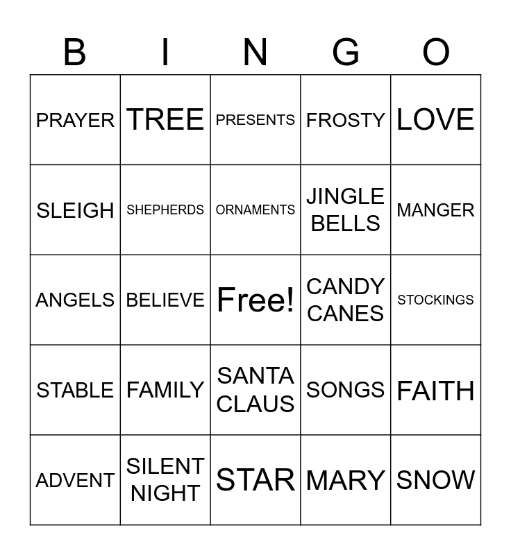 This bingo card has a free space and 34 words: BABY JESUS, MARY, JOSEPH, BETHLEHEM, STABLE, SHEPHERDS, LOVE, ADVENT, TREE, LIGHTS, ORNAMENTS, PRESENTS, CANDLES, DECORATIONS, CANDY CANES, MANGER, SILENT NIGHT, ANGELS, FAMILY, SONGS, SANTA CLAUS, ELF, PRAYER, STOCKINGS, STAR, SNOW, FROSTY, REINDEER, JINGLE BELLS, SLEIGH, TOYS, BELIEVE, FAITH and WORSHIP.