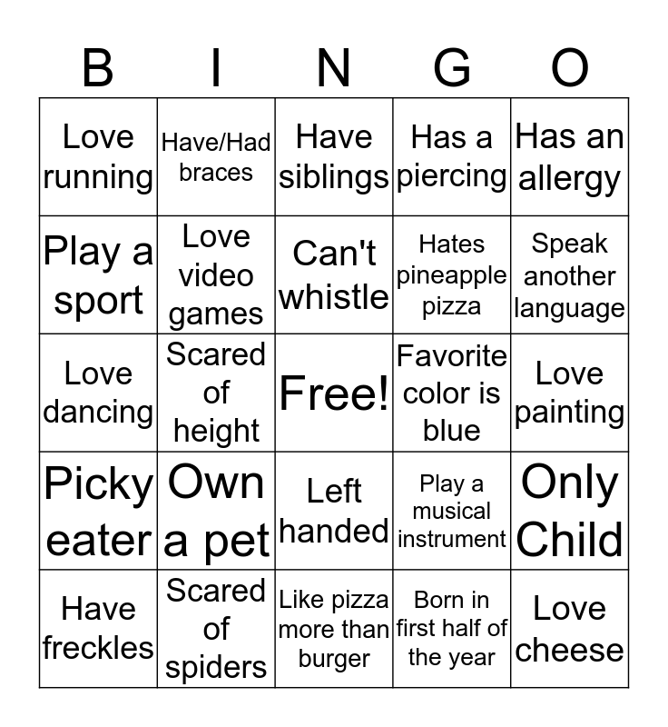 This bingo card has a free space and 24 words: Own a pet, Scared of spiders, Can't whistle, Have freckles, Has an allergy, Love running, Play a sport, Have/Had braces, Favorite color is blue, Left handed, Hates pineapple pizza, Love dancing, Play a musical instrument, Only Child, Love video games, Born in first half of the year, Love painting, Have siblings, Speak another language, Scared of height, Love cheese, Picky eater, Has a piercing and Like pizza more than burger.