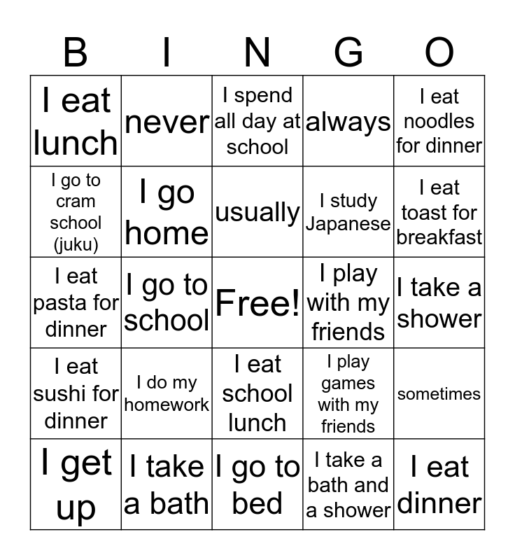 This bingo card has a free space and 29 words: I get up, I eat breakfast, I go to school, I study English, I eat lunch, I spend all day at school, I go home, I do my homework, I play with my friends, I take a bath, I take a shower, I eat dinner, I go to bed, I take a bath and a shower, I eat toast for breakfast, I eat cereal for breakfast, I eat school lunch, I eat sushi for dinner, I eat noodles for dinner, I eat pasta for dinner, I play games with my friends, I play sport with my friends, I study Japanese, I go to cram school (juku), always, never, sometimes, usually and at night.