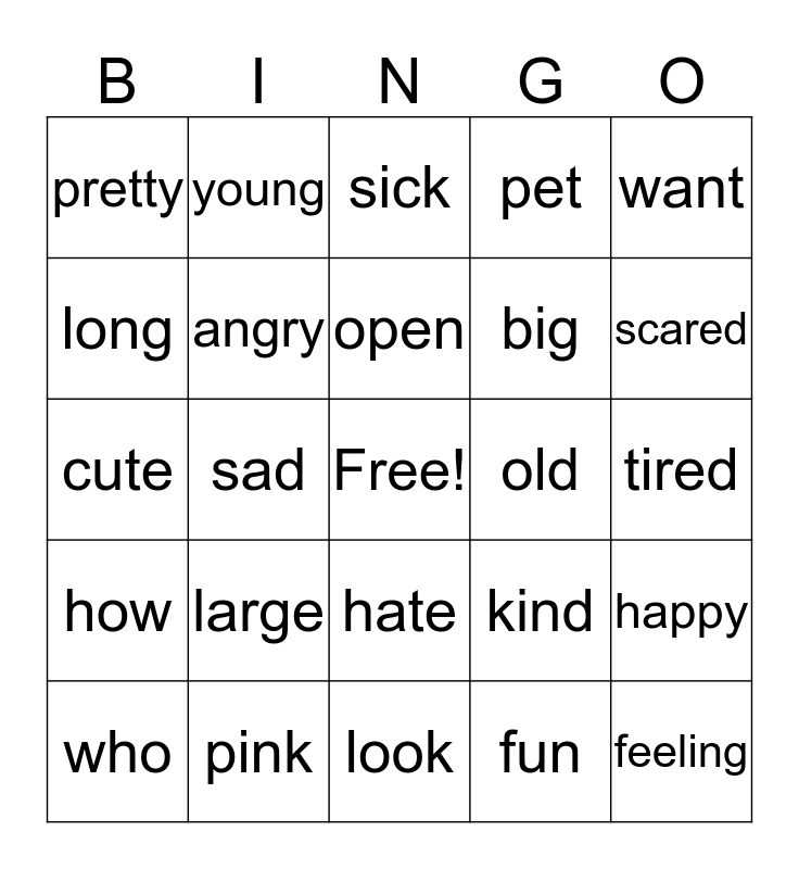 This bingo card has a free space and 24 words: large, pink, open, who, want, pretty, long, young, old, hate, big, cute, kind, happy, angry, fun, tired, sick, scared, sad, feeling, how, pet and look.