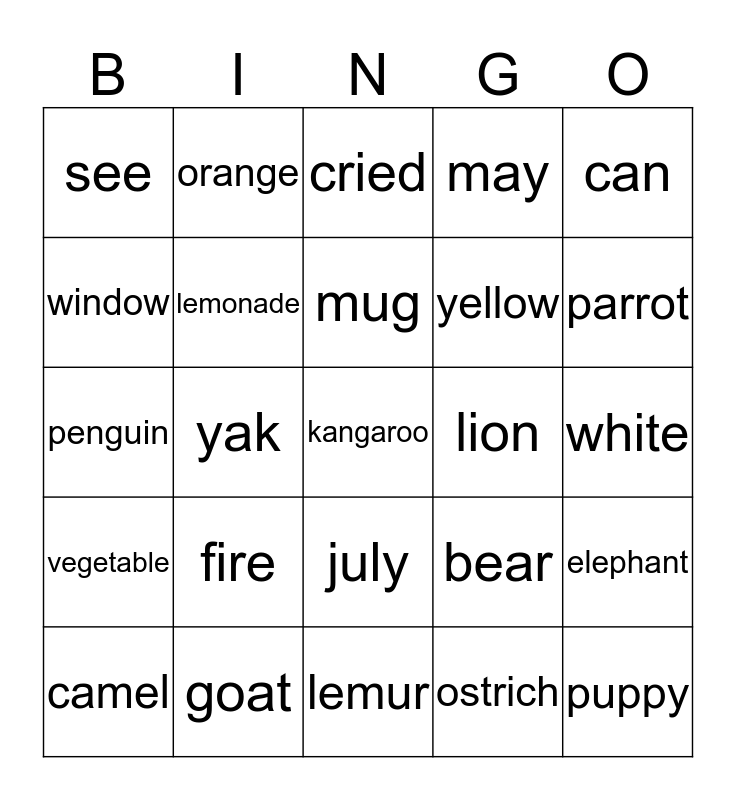 This bingo card has a free space and 29 words: wolf, goat, cried, help, can, see, lemonade, mug, lion, elephant, camel, yak, ostrich, puppy, penguin, tiger, lemur, bear, parrot, vegetable, fire, fire truck, yellow, white, window, orange, july, may and june.