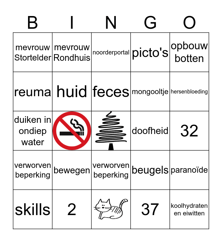 This bingo card has 2 images, a free space and 22 words: bewegen, 2, feces, skills, opbouw botten, mevrouw Stortelder, reuma, mevrouw Rondhuis, doofheid, verworven beperking, mongooltje, duiken in ondiep water, beugels, paranoïde, huid, 37, 32, noorderportal, hersenbloeding, koolhydraten en eiwitten, verworven beperking and picto's.