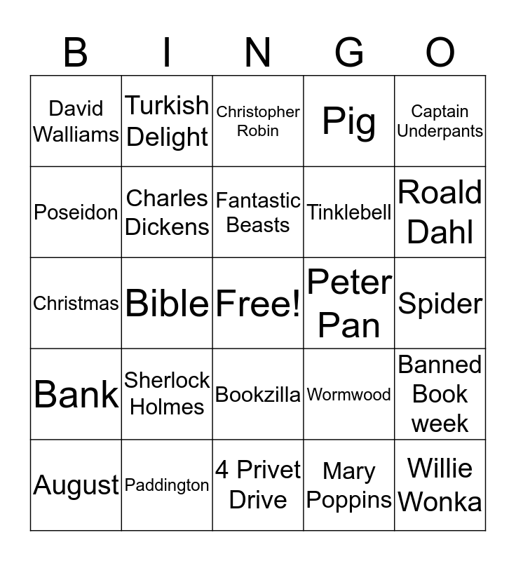 This bingo card has a free space and 29 words: August, Jeff Kinney, Bible, Mowgli, David Walliams, Christopher Robin, Charles Dickens, Sherlock Holmes, Peter Pan, Paddington, Spider, Willie Wonka, 4 Privet Drive, Mary Poppins, Roald Dahl, French, Bookzilla, Bank, Captain Underpants, Christmas, Wormwood, Ravenclaw, Tinklebell, Poseidon, Pig, Turkish Delight, Banned Book week, Fantastic Beasts and Fox.