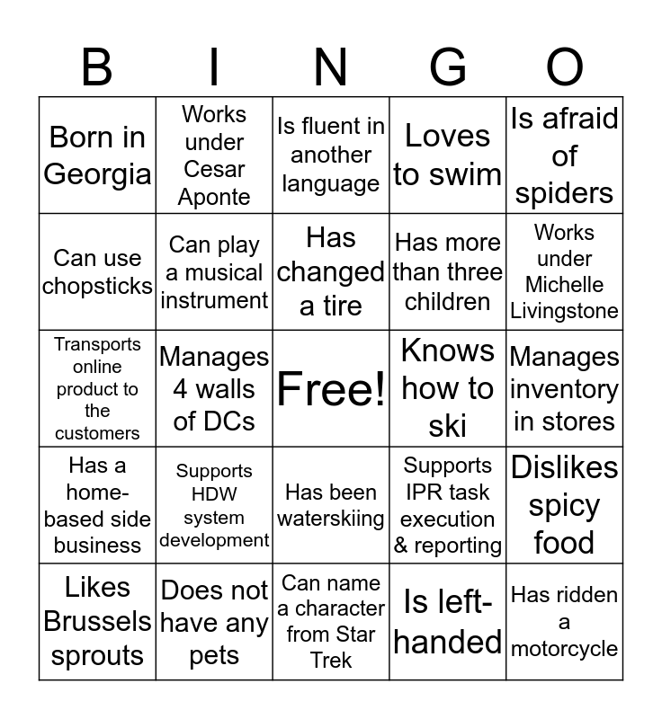 This bingo card has a free space and 60 words: Has been to Europe, Does not have any pets, Had/has braces, Has a home-based side business, Is left-handed, Can salsa dance, Can play a musical instrument, Failed their first driving test, Has more than three children, Wears socks to bed, Loves to swim, Can whistle, Can use chopsticks, Has never broken a bone, Does not like coffee, Born in Georgia, Has ridden a motorcycle, Is afraid of spiders, Loves country music, Has changed a tire, Knows how to ski, Is fluent in another language, Likes Brussels sprouts, Dislikes spicy food, Likes superhero movies, Has blue eyes, Wears glasses, Has a pet with no fur, Works under Michelle Livingstone, Works under Paul Larkin, Works under Stephanie Smith, Works under Colby Chiles, Works under Jen McKeehan, Works under Alex Hamrick, Works under Cesar Aponte, Manages moving freight to DCs, Creates savings through store delivery, Manages 4 walls of DCs, Manages customer delivery out of stores, Transports online product to the customers, Focuses on customer orders from vendors/DFC, Supports HDW system development, Manages inventory in stores, Order product for events, Supports IPR task execution & reporting, Can write SQL, Does not know how to do a pivot table, Understands the CEILING function in Excel, Doesn't have a Facebook page, Has been waterskiing, Can name a character from Star Trek, Speaks another language, Has been with The Home Depot for over 5 years, Has never used a rotary phone, Wears a watch (not a smartwatch), Believes Elvis Presley is alive, Is good at drawing, Flosses twice a day, Starts work before 8am every day and Brings lunch from home nearly every day.