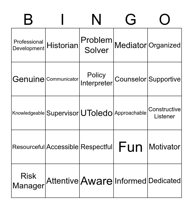 This bingo card has a free space and 29 words: Risk Manager, Mentor, Supervisor, Liaison, Professional Development, Problem Solver, Communicator, Accessible, Approachable, Attentive, Constructive Listener, Dedicated, Aware, Informed, Supportive, Open-Minded, Respectful, Resourceful, Organized, Knowledgeable, Fun, Student-Oriented, Counselor, Genuine, Mediator, Historian, Motivator, Policy Interpreter and Team Builder.