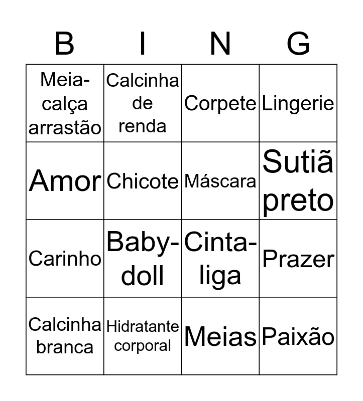 This bingo card has 16 words: Calcinha branca, Hidratante corporal, Corpete, Lingerie, Amor, Calcinha de renda, Cinta-liga, Prazer, Meia-calça arrastão, Chicote, Meias, Sutiã preto, Carinho, Baby-doll, Máscara and Paixão.