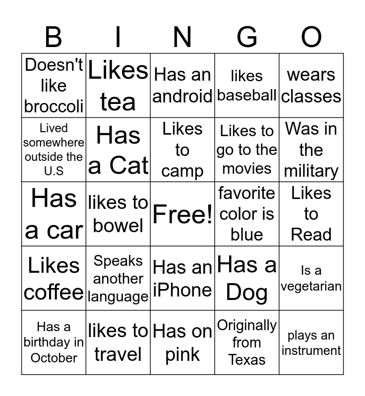 This bingo card has a free space and 24 words: Speaks another language, likes to travel, Likes to camp, Has a birthday in October, wears classes, Doesn't like broccoli, Lived somewhere outside the U.S, Likes tea, favorite color is blue, Has an iPhone, Likes to go to the movies, Has a car, Has a Dog, Is a vegetarian, Has a Cat, Originally from Texas, Likes to Read, Has an android, Was in the military, likes to bowel, plays an instrument, Likes coffee, likes baseball and Has on pink.