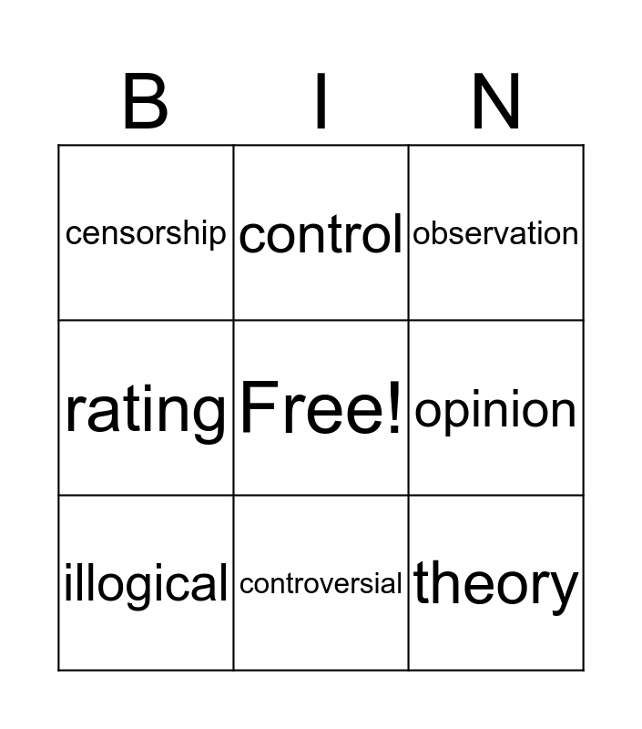This bingo card has a free space and 8 words: opinion, observation, control, illogical, censorship, theory, rating and controversial.