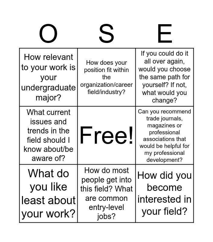 This bingo card has a free space and 13 words: What is a typical day (or week) like for you?, What do you like most about your work?, What do you like least about your work?, How does your position fit within the organization/career field/industry?, What current issues and trends in the field should I know about/be aware of?, How did you become interested in your field?, What are some common career paths in your field?, What kinds of accomplishments tend to be valued and rewarded in this field?, How do most people get into this field? What are common entry-level jobs?, How relevant to your work is your undergraduate major?, Can you recommend trade journals, magazines or professional associations that would be helpful for my professional development?, If you could do it all over again, would you choose the same path for yourself? If not, what would you change? and What advice would you give someone who is considering this type of job (or field)?.