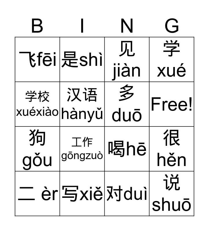 This bingo card has 17 words: 对duì, 二 èr, 见jiàn, 飞fēi, 工作gōngzuò, 学xué, 很hěn, 多 duō, Free!, 汉语hànyǔ, 写xiě, 喝hē, 学校 xuéxiào, 是shì, 狗gǒu, 妈妈māmā and 说shuō.