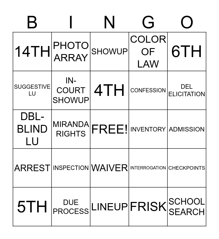 This bingo card has a free space and 25 words: INSPECTION, LINEUP, 4TH, 5TH, 6TH, 14TH, SUGGESTIVE LU, PHOTO ARRAY, INVENTORY, WAIVER, CONFESSION, DBL-BLIND LU, INTERROGATION, CHECKPOINTS, IN-COURT SHOWUP, CUSTODY, ADMISSION, SHOWUP, DEL ELICITATION, MIRANDA RIGHTS, SCHOOL SEARCH, DUE PROCESS, ARREST, COLOR OF LAW and FRISK.