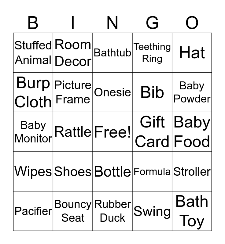 This bingo card has a free space and 39 words: Car Seat, Blanket, Diapers, Picture Frame, Pacifier, Bottle, Onesie, Socks, Hat, Wipes, Rattle, Teething Ring, Bath Toy, Baby Food, Gift Card, Shoes, Book, Stuffed Animal, Baby Lotion, Formula, Burp Cloth, Rubber Duck, Bib, Baby Powder, Cash, Wash Cloth, Hooded Towel, Baby Shampoo, Sippy Cup, Room Decor, Diaper Bag, Teddy Bear, Bathtub, Bouncy Seat, Swing, High Chair, Stroller, Baby Monitor and Carrier.