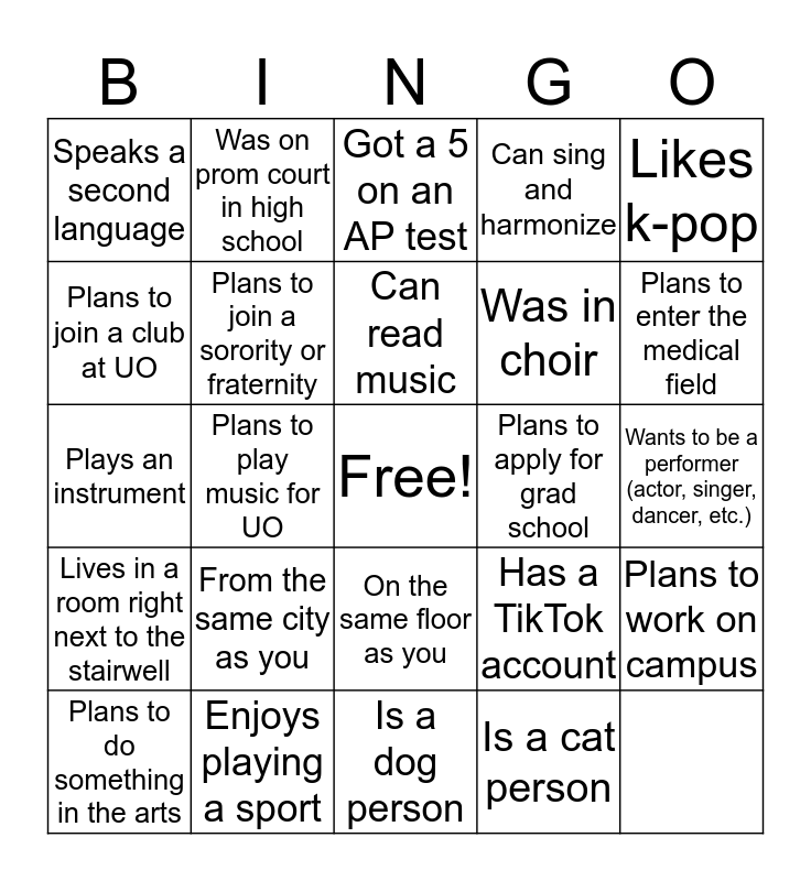 This bingo card has a free space and 24 words: Lives in a room right next to the stairwell, Enjoys playing a sport, On the same floor as you, Has a TikTok account, Likes k-pop, Speaks a second language, Was on prom court in high school, Got a 5 on an AP test, Was in choir, Plans to work on campus, Plans to join a club at UO, Plans to join a sorority or fraternity, Plans to play a sport for UO, Plans to apply for grad school, Plans to enter the medical field, Plans to do something in the arts, Plans to play music for UO, Can read music, Can sing and harmonize, Wants to be a performer (actor, singer, dancer, etc.), Plays an instrument, From the same city as you, Is a dog person and Is a cat person.
