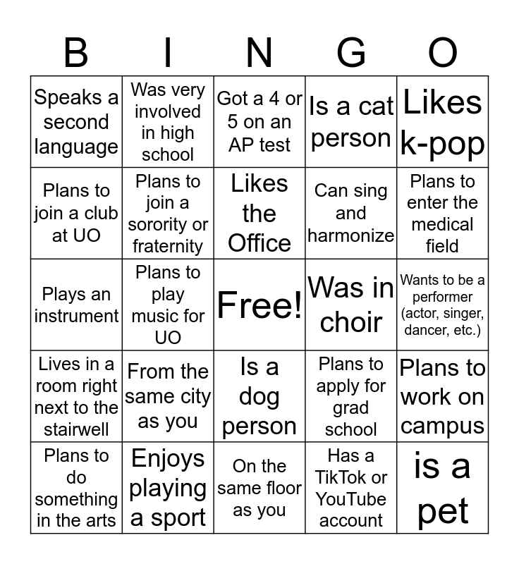 This bingo card has a free space and 25 words: Lives in a room right next to the stairwell, Enjoys playing a sport, On the same floor as you, Has a TikTok or YouTube account, Likes k-pop, Speaks a second language, Was very involved in high school, Got a 4 or 5 on an AP test, Was in choir, Plans to work on campus, Plans to join a club at UO, Plans to join a sorority or fraternity, Plans to play a sport for UO, Plans to apply for grad school, Plans to enter the medical field, Plans to do something in the arts, Plans to play music for UO, Likes the Office, Can sing and harmonize, Wants to be a performer (actor, singer, dancer, etc.), Plays an instrument, From the same city as you, Is a dog person, Is a cat person and is a pet.