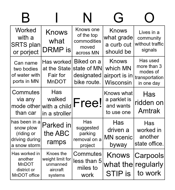 This bingo card has a free space and 29 words: Has worked in another MnDOT district or MnDOT office, Commutes more than 45 minutes to work, Has walked with a child in a stroller, Ridden in a greater MN transit Bus, Worked with a SRTS plan or porject, Knows one of the top commodities moved across MN, Has worked at the State Fair for MnDOT, Parked in the ABC ramps, Knows what a parklet is and wants to use one, Knoes the weight limit for unmanned aircraft systems, Has ridden on Amtrak, Carpools regularly to work, Commutes less than 5 miles to work, Knows what the STIP is, Has used more than 3 modes of transportation in one day, Knows one of the 7 largest (class 1) railroads that operate in MN, Has suggested parking removal on a project, has been in a snow plow (riding or driving during a snow storm, Lives in a community without traffic signals, Commutes via any mode other than car, Has driven a MN scenic byway, Has walked or biked with a child to school, Knows which MN airport is in Wisconsin, Can name two bodies of water with ports in MN, Knows what grade a curb cut should be, Knows what DRMP is, Has worked in another state office., Biked on a state of MN designated bike route. and Knows approximately how many miles of bus only shoulders are in MN..