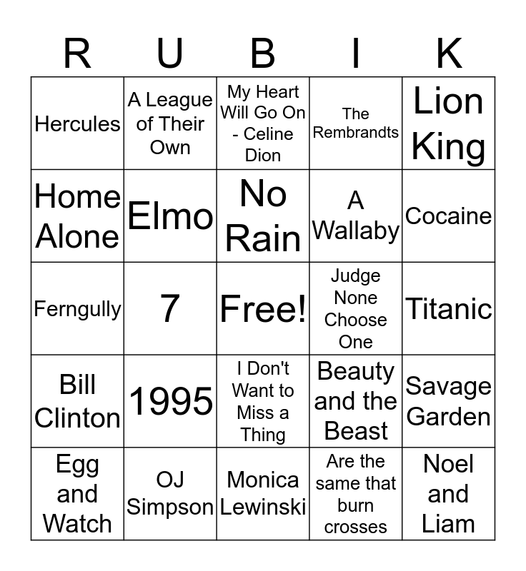 This bingo card has a free space and 42 words: Backstreet Boys, No Rain, Sweden, 1995, Are the same that burn crosses, Savage Garden, Noel and Liam, Geto Boys, My Heart Will Go On - Celine Dion, I Don't Want to Miss a Thing, Titanic, Cocaine, 7, Lion King, Toy Story 2, Beauty and the Beast, The Bodyguard, Ferngully, The Matrix, A League of Their Own, Home Alone, T-1000, Rugrats, Hercules, Spongebob Squarepants, A Belt, A Wallaby, Happy Happy Joy Joy, Get Along With Each Other, Kenny, Professor Utonium, Bill Clinton, Elmo, Monica Lewinski, Nancy Kerrigan, Egg and Watch, OJ Simpson, Judge None Choose One, Dolly, Citrus, The Rembrandts and Jessica Simpson.