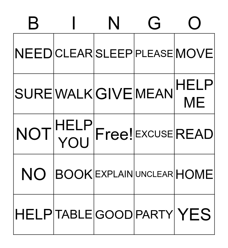 This bingo card has a free space and 24 words: BOOK, TABLE, GIVE, HELP, MOVE, NEED, SURE, CLEAR, EXCUSE, EXPLAIN, MEAN, NOT, UNCLEAR, HOME, WALK, PARTY, READ, SLEEP, HELP ME, HELP YOU, YES, NO, PLEASE and GOOD.