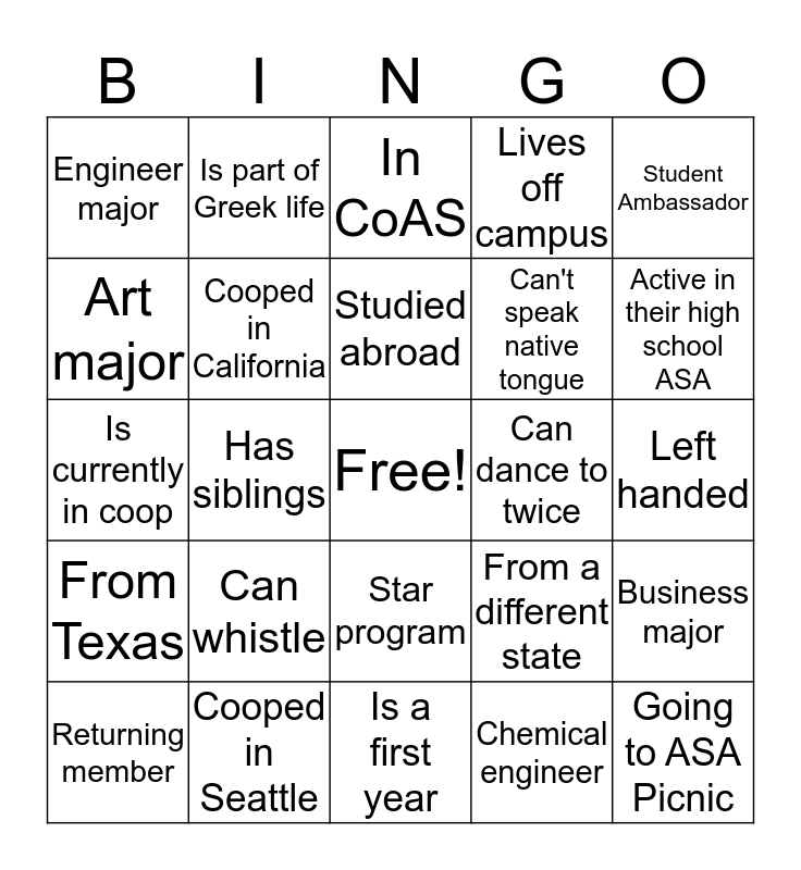 This bingo card has a free space and 24 words: Can whistle, Cooped in Seattle, Studied abroad, Returning member, Student Ambassador, Engineer major, Art major, Is part of Greek life, Can dance to twice, Star program, Can't speak native tongue, Is currently in coop, From a different state, Business major, Cooped in California, Chemical engineer, Left handed, In CoAS, Active in their high school ASA, Has siblings, Going to ASA Picnic, From Texas, Lives off campus and Is a first year.