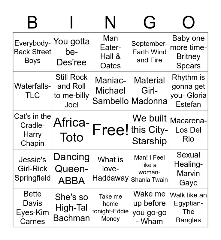 This bingo card has a free space and 26 words: What is love-Haddaway, Wake me up before you go-go - Wham, Maniac-Michael Sambello, She's so High-Tal Bachman, Baby one more time-Britney Spears, Everybody-Back Street Boys, Waterfalls-TLC, You gotta be-Des'ree, Macarena-Los Del Rio, Man! I Feel like a woman-Shania Twain, Material Girl-Madonna, Cat's in the Cradle- Harry Chapin, Sexual Healing-Marvin Gaye, Bette Davis Eyes-Kim Carnes, Africa-Toto, Come on Eileen-Dexy's Midnight Runners, September-Earth Wind and Fire, Jessie's Girl-Rick Springfield, Man Eater- Hall & Oates, Walk like an Egyptian-The Bangles, Rhythm is gonna get you- Gloria Estefan, Take me home tonight-Eddie Money, We built this City-Starship, Dancing Queen-ABBA, Still Rock and Roll to me-billy Joel and Hazy Shade of Winter-The Bangles.