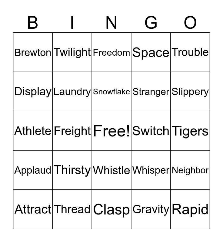 This bingo card has a free space and 34 words: Bridge, Gravity, Hungry, Eclipse, Applaud, Laundry, Trouble, Attract, Twilight, Describe, Snowflake, Freedom, Glance, Burglar, Switch, Slippery, Thread, Athlete, Thirsty, Whisper, Whistle, Nowhere, Brewton, Tigers, Clasp, Rapid, Space, Later, Stranger, Display, Explain, Freight, Neighbor and Weigh.