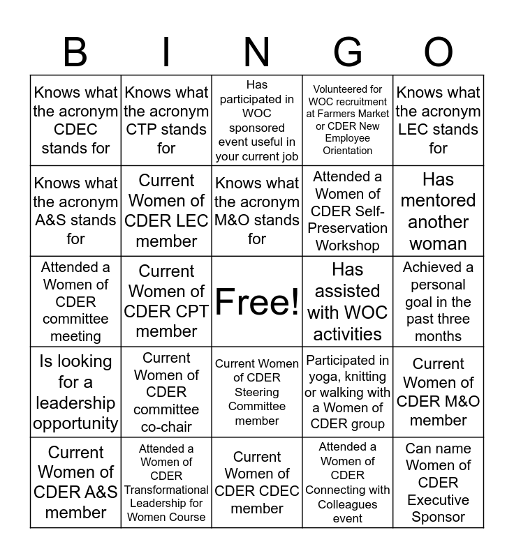 This bingo card has a free space and 24 words: Current Women of CDER committee co-chair, Attended a Women of CDER Transformational Leadership for Women Course, Knows what the acronym M&O stands for, Current Women of CDER A&S member, Knows what the acronym LEC stands for, Knows what the acronym CDEC stands for, Knows what the acronym A&S stands for, Knows what the acronym CTP stands for, Has assisted with WOC activities, Current Women of CDER Steering Committee member, Attended a Women of CDER Self-Preservation Workshop, Attended a Women of CDER committee meeting, Participated in yoga, knitting or walking with a Women of CDER group, Current Women of CDER M&O member, Current Women of CDER LEC member, Attended a Women of CDER Connecting with Colleagues event, Achieved a personal goal in the past three months, Has participated in WOC sponsored event useful in your current job, Has mentored another woman, Current Women of CDER CPT member, Can name Women of CDER Executive Sponsor, Is looking for a leadership opportunity, Volunteered for WOC recruitment at Farmers Market or CDER New Employee Orientation and Current Women of CDER CDEC member.