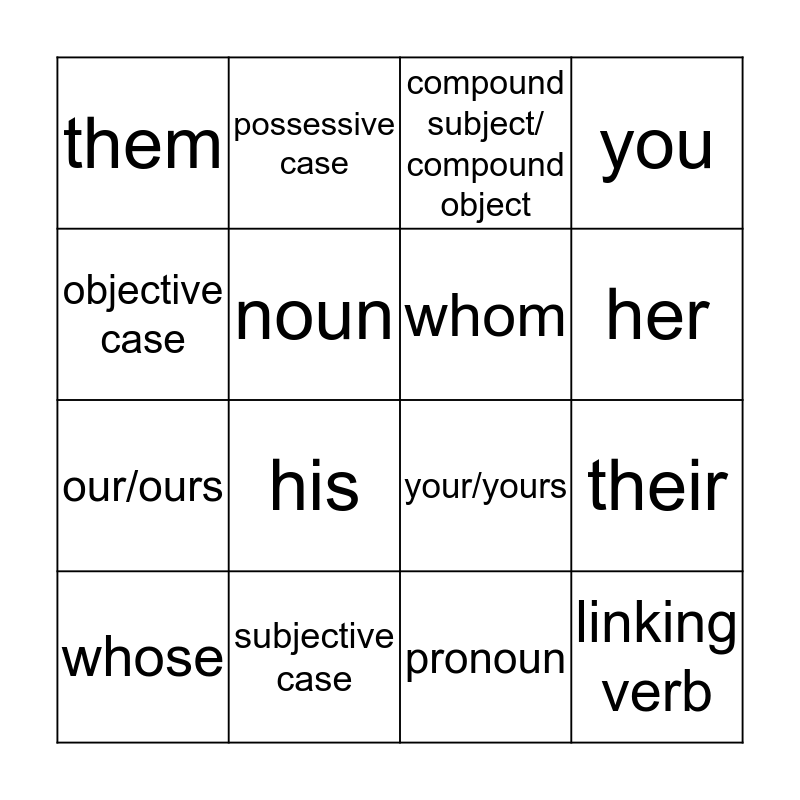 This bingo card has 16 words: subjective case, their, compound subject/ compound object, them, our/ours, possessive case, your/yours, pronoun, objective case, noun, whose, you, his, her, whom and linking verb.