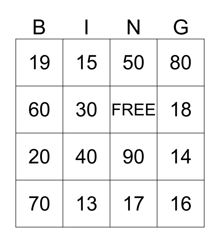 This bingo card has 16 words: 13, 14, 50, 19, 20, 15, 90, 17, 60, 30, 70, 80, 40, 18, FREE and 16.