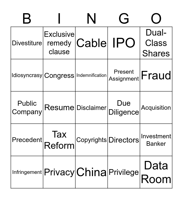 This bingo card has 77 words: Free!, Regulations, Indemnification, Mergers, Antitrust, Dodd-Frank, yahoo!, FCC, Media, Trade Secrets, Infringement, Patents, Copyrights, Present Assignment, Board of Trustees of the Leland Stanford Junior University v. Roche Molecular Systems, Idiosyncrasy, Privacy, China, Undue Restrictions, Fraud, Reliance, Exclusive remedy clause, Disclaimer, IPO, Dual-Class Shares, Snap, Purchase Agreements, Buyer, Seller, Loophole, Trump, Regime, Cross-Border, Directors, Acquisition, Divestiture, Common Stock, Arbitration, Due Diligence, Investment Banker, Integration Clause, Disclaimer, Closing, Venture Capital, Ajit Pai, Content, Tax Reform, Cable, Telecom, Interest rates, Regulations, Congress, Delaware, Representations, Breach, Cap, Basket, Boilerplate, Release, Data Room, Public Company, Benchmark, LOI, NOLS, Hart Scott Rodino Act, NYSE, Nasdaq, Footfall, Disclosure Schedule, Bankers, 280G, Resume, Severance, Privilege, Standard, Precedent and Action.