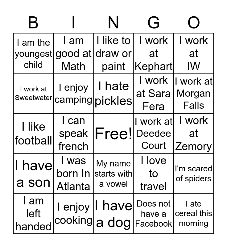 This bingo card has a free space and 24 words: I was born In Atlanta, I enjoy cooking, I hate pickles, I am left handed, I work at IW, I am the youngest child, I work at Sweetwater, I am good at Math, I work at Deedee Court, My name starts with a vowel, I work at Sara Fera, I like football, I love to travel, I'm scared of spiders, I enjoy camping, Does not have a Facebook, I work at Zemory, I like to draw or paint, I work at Morgan Falls, I can speak french, I ate cereal this morning, I have a son, I work at Kephart and I have a dog.