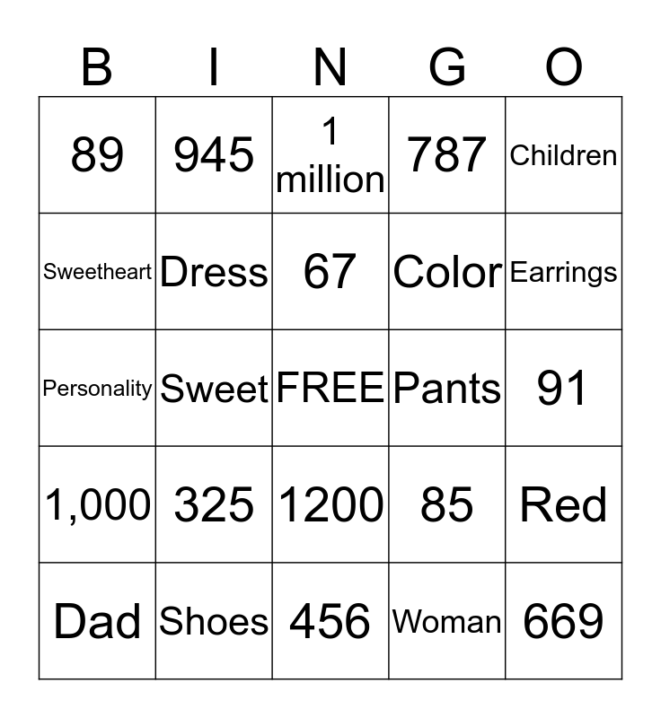 This bingo card has a free space and 34 words: 500, Woman, Innocent, Wise, 1,000, Dress, Children, Dad, 945, 79, 67, 1 million, 1 billion, Happy, Pants, Earrings, Shoes, Personality, 325, 85, 1200, 600, 89, 91, 456, 669, 787, 7879, Color, Sweetheart, Rude, Sweet, Red and Orange.