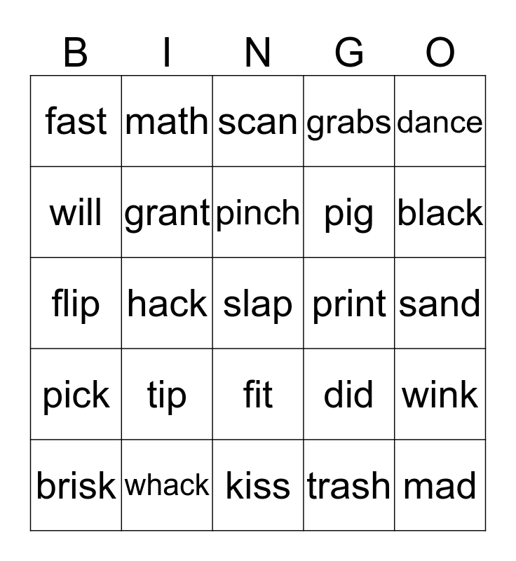 This bingo card has a free space and 34 words: chat, trash, split, twin, pick, grant, dance, brisk, math, zap, pinch, scan, wing, swam, print, black, whack, flip, tip, did, fit, crack, fast, sand, kiss, mad, grabs, bin, pig, will, drag, hack, wink and clip.