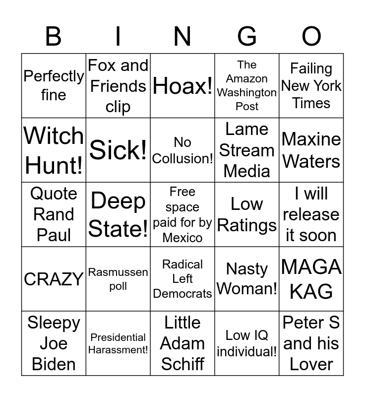 This bingo card has a free space and 24 words: Rasmussen poll, Presidential Harassment!, No Collusion!, Sleepy Joe Biden, Failing New York Times, Perfectly fine, Witch Hunt!, Fox and Friends clip, Low Ratings, Radical Left Democrats, Lame Stream Media, Quote Rand Paul, Nasty Woman!, MAGA KAG, Sick!, Low IQ individual!, I will release it soon, Hoax!, Maxine Waters, Deep State!, Peter S and his Lover, CRAZY, The Amazon Washington Post and Little Adam Schiff.