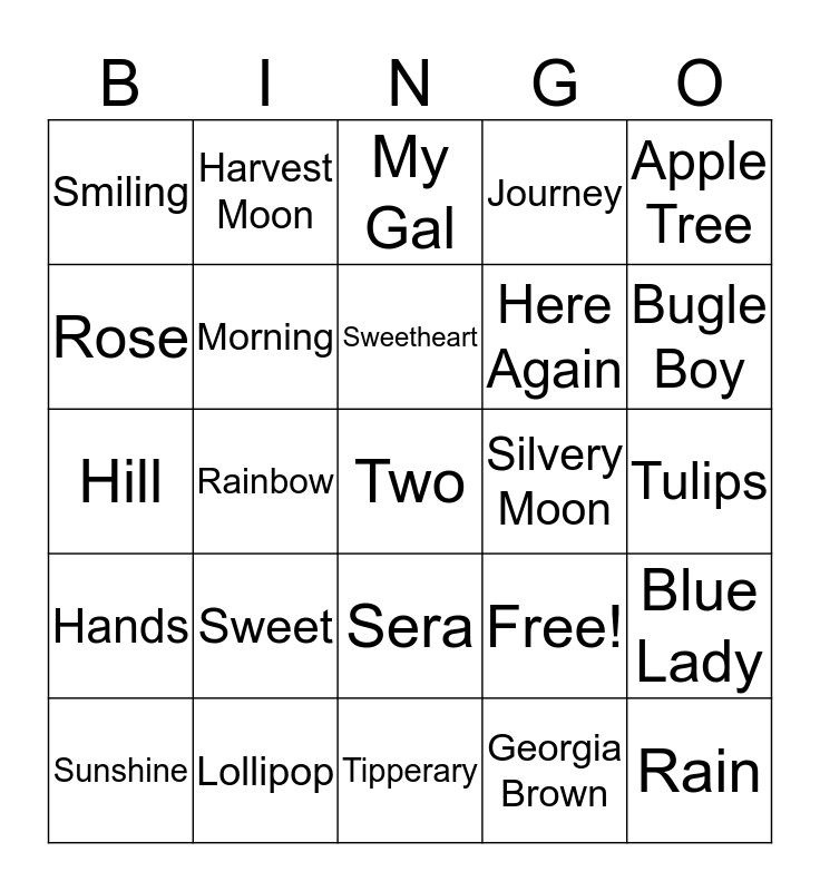 This bingo card has 25 words: Sweet, Tipperary, Sweetheart, Sunshine, Apple Tree, Smiling, Rose, Harvest Moon, Silvery Moon, Sera, Here Again, Hill, Free!, Blue Lady, Morning, Rain, Tulips, My Gal, Bugle Boy, Rainbow, Two, Lollipop, Hands, Journey and Georgia Brown.