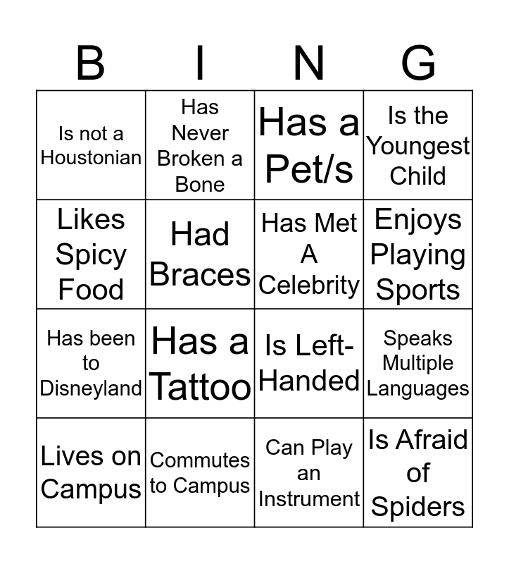 This bingo card has 16 words: Commutes to Campus, Speaks Multiple Languages, Has a Pet/s, Is not a Houstonian, Has been to Disneyland, Has Never Broken a Bone, Is Left-Handed, Can Play an Instrument, Likes Spicy Food, Had Braces, Lives on Campus, Is the Youngest Child, Has a Tattoo, Enjoys Playing Sports, Has Met A Celebrity and Is Afraid of Spiders.