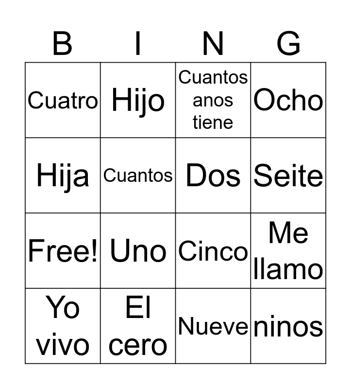 This bingo card has 20 words: Me llamo, Como se llama, Cuantos anos tiene, Tres, Yo vivo, Hija, El cero, Cuatro, Free!, Hijo, Uno, Cinco, Cuantos, ninos, Dos, Seis, Seite, Ocho, Nueve and Diez.