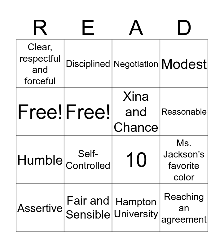 This bingo card has 16 words: Fair and Sensible, Ms. Jackson's favorite color, Negotiation, Clear, respectful and forceful, Humble, Disciplined, 10, Hampton University, Free!, Free!, Assertive, Modest, Self-Controlled, Reasonable, Xina and Chance and Reaching an agreement.