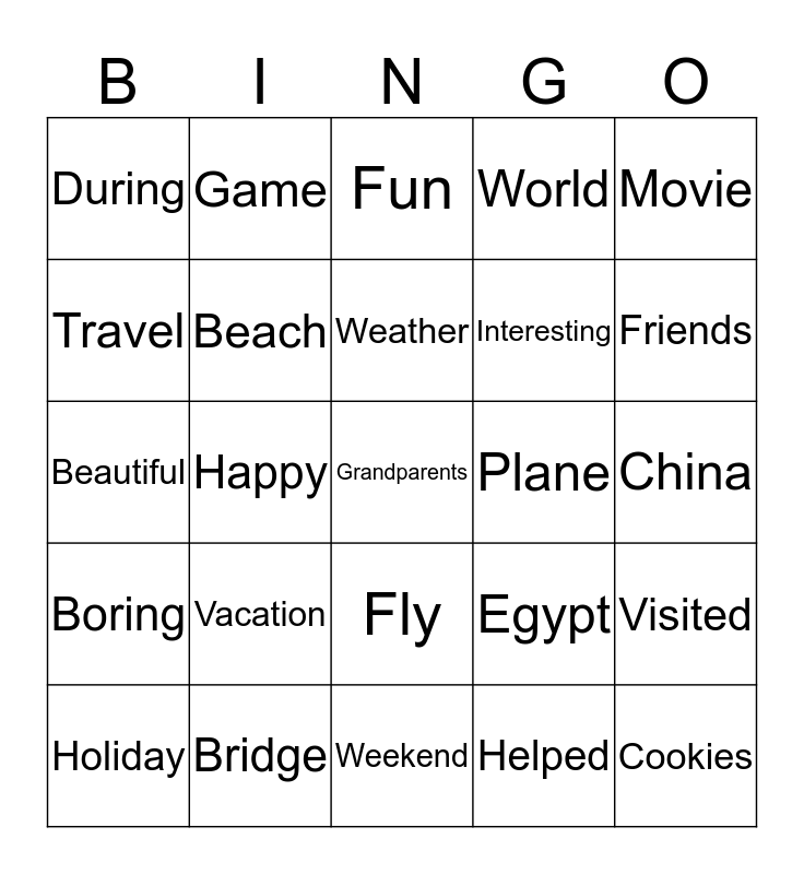 This bingo card has 25 words: Vacation, Weekend, Weather, Holiday, Movie, During, Travel, Game, Plane, Fly, Interesting, Beautiful, Egypt, Visited, Beach, Cookies, China, Fun, Friends, Happy, Grandparents, Bridge, Boring, World and Helped.