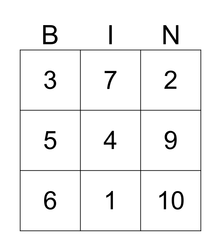 This bingo card has 10 words: 1, 2, 3, 4, 5, 6, 7, 8, 9 and 10.