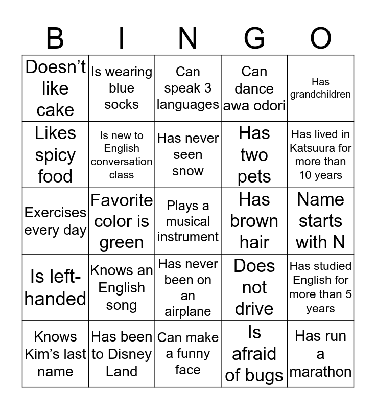 This bingo card has 37 words: Free!, Grows mikan, Has been to America, Is new to English conversation class, Has studied English for more than 5 years, Knows an English song, Has never seen snow, Likes math, Has grandchildren, Has the same birthday as you, Favorite color is green, Can dance awa odori, Plays a musical instrument, Name starts with N, Likes spicy food, Is left-handed, Plays volleyball, Can speak 3 languages, Has never been on an airplane, Has brown hair, Doesn’t like cake, Has lived in Katsuura for more than 10 years, Knows Kim’s last name, Can make a funny face, Walked to English conversation class today, Is afraid of bugs, Is wearing blue socks, Drank coffee today, Has the same hobby as you, Is good at singing, Goes to sleep before 11pm, Has been to Disney Land, Exercises every day, Has run a marathon, Does not drive, Has two pets and Can say 千 in English.